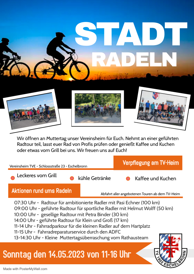 Es freut mich außerdem sehr, Sie alle noch zu einem Highlight der diesjährigen Stadtradeln-Kampagne einzuladen. Am Sonntag den 14. Mai (Muttertag) findet nämlich von 11 bis 16 Uhr ein Stadtradeln-Aktionstag auf dem Gelände des TV-Heims statt. An diesem Tag wird es ein buntes Rahmenprogramm rund ums Radeln geben. Wie bereits im Vorjahr haben wir eine Auswahl an geführten Radtouren im Angebot.